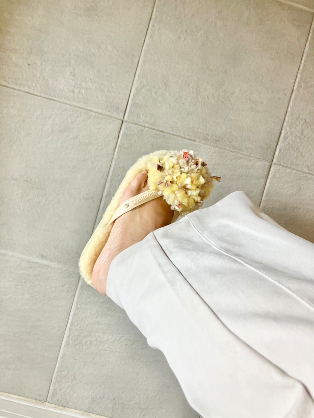 春の新色、注目のバターイエローのムートンにバタークリームカラーの鼻緒。 TopはSlimに比べ鼻緒が太く、厚みのあるソールで、安定感とクッション性を備えた履き心地です。 ボンボンはモヘアやアクリルのバターイエローやベージュをミックスして、同色系に。 ゴールド糸がチラチラと光って 春の優しさあふれる、おすすめのカラーです。 パープル、ベージュなど、 ブロックプリントの生地をあしらって 動きもだしました。 お外履きはもちろん、ルームシューズやオフィスにも、大活躍のムートンジェリサン。 ハワイアナスのベースにオーストラリア産のリアルムートンの中敷がついて、フワフワな履き心地。 リアルムートンなので、抜群の通気性と、保温、保湿性にもすぐれ、ムレもなく快適な履き心地。 天然の素材ですので、若干の色落ちの可能性がございます。 ハンドメイド商品ですので、中敷の貼りズレ等が若干ございますが、支障なくお履き頂けます。 履き込むうちに、中敷ムートン部分、指のアタリが剥げる可能性がございますが、自然のものですのでご了承下さいませ。 サイズ感です。 サイズS—-22-22.5cm サイズM---23-23.5cm サイズL---24-24.5cm サイズLL—-25-26cm