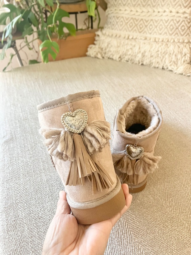 ムートンハーフブーツ 撥水加工を施して多少の雨や雪の日にも大活躍! ソールも滑り止めの溝付きです。 起毛ベージュのベースに、 タッセルは同色のレザーとウールの組み合わせ。 後ろ姿が可愛い、褒められブーツです❤︎ ハートコンチョ付き。 (変更希望の方は備考欄にご記入下さい) フェイクファーのハーフムートンブーツです。 滑らかなスエード生地使用。 足長効果も抜群の丈感で、どんなコーディネートにも似合います。 撥水加工、グリップソールで、 機能性にも優れ、 寒い冬のお散歩もhappy に❤︎ サイズ感です。 M(23-ちいさめ23.5cm) L(大きめ23.5-小さめ24.cm) LL(24-24.5cm)