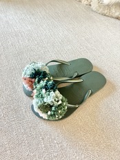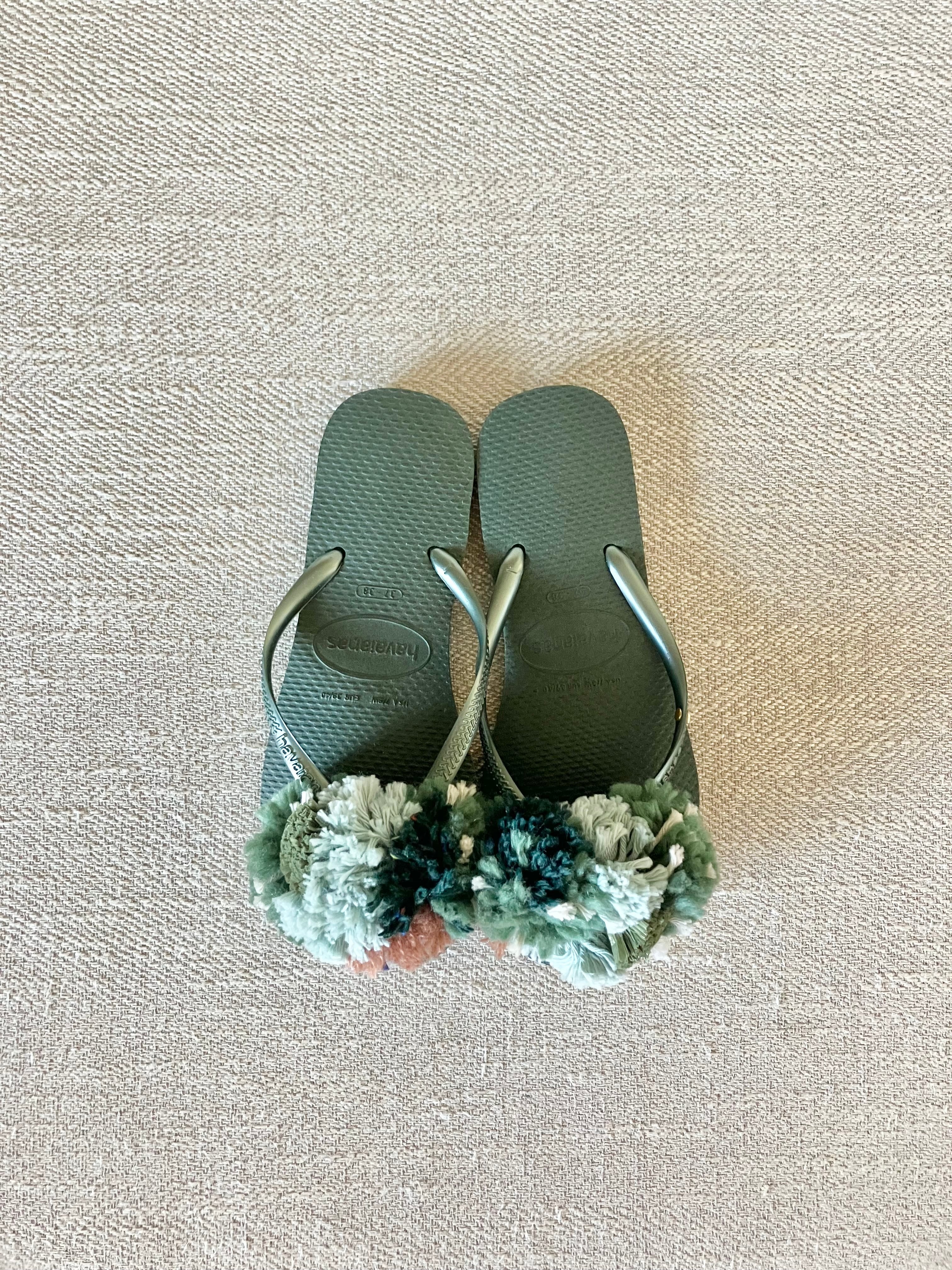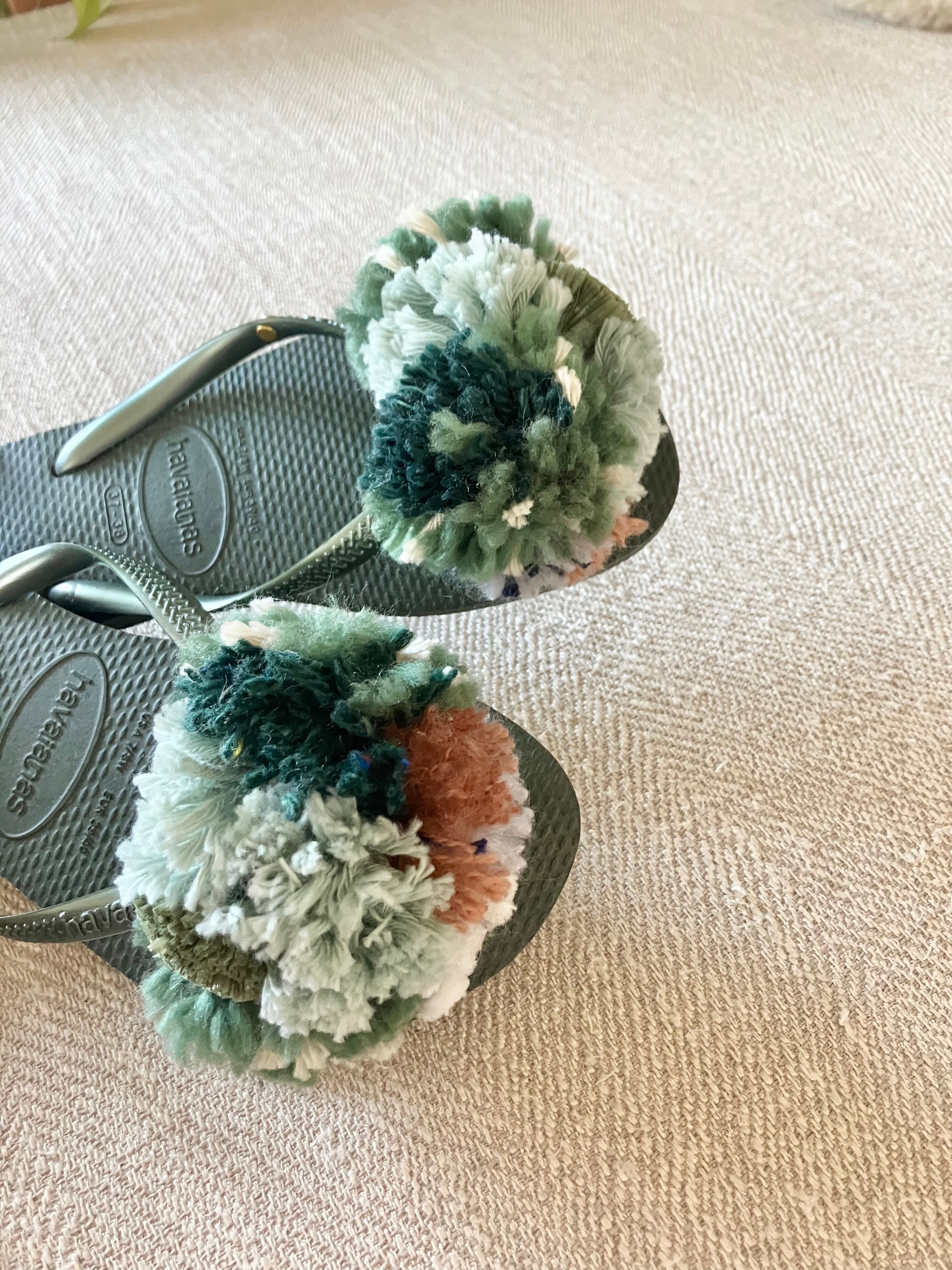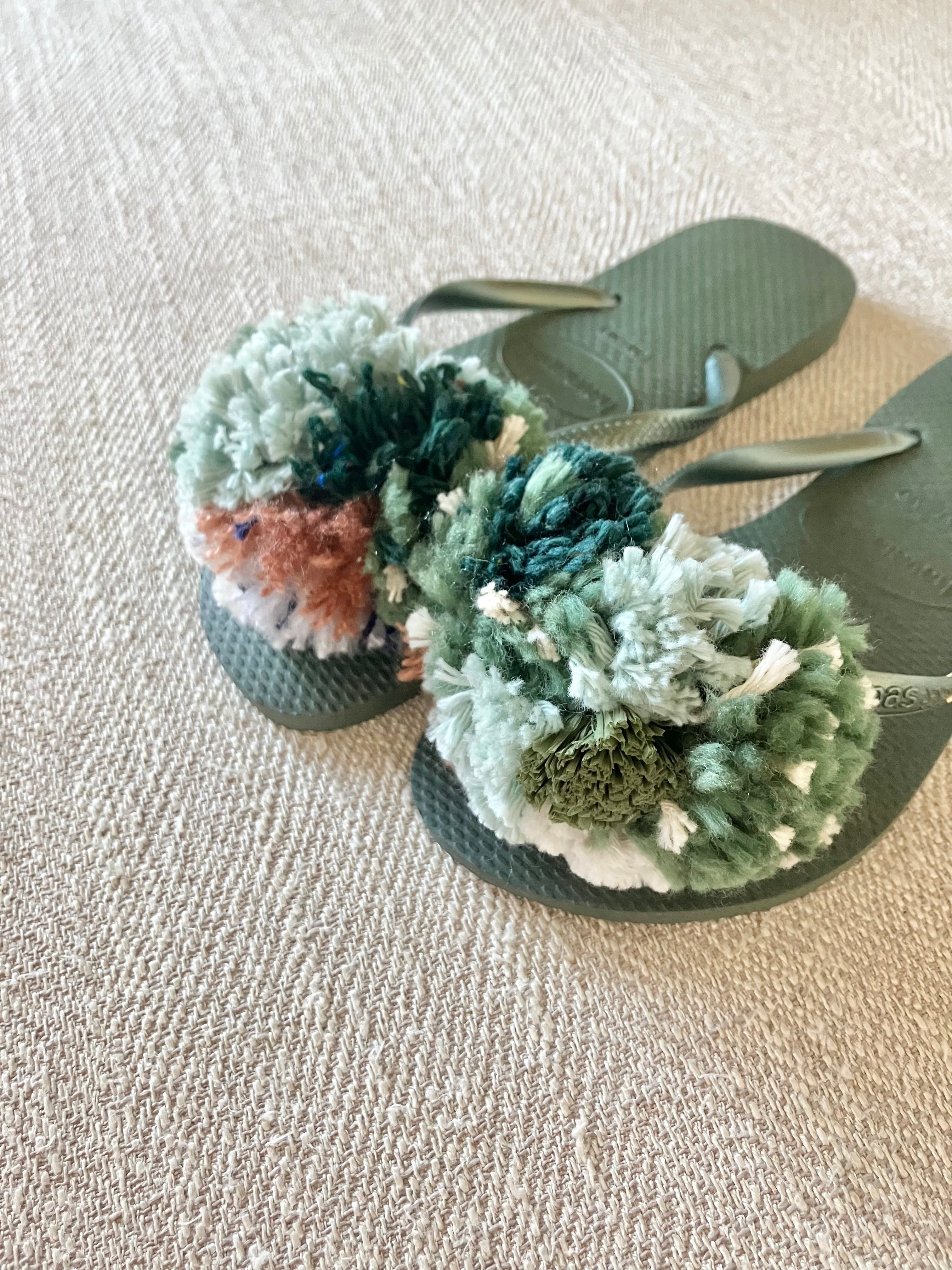カーキのグラデーションに、テラコッタ、ブルーグレーのウールやアクリルミックスボンボン、