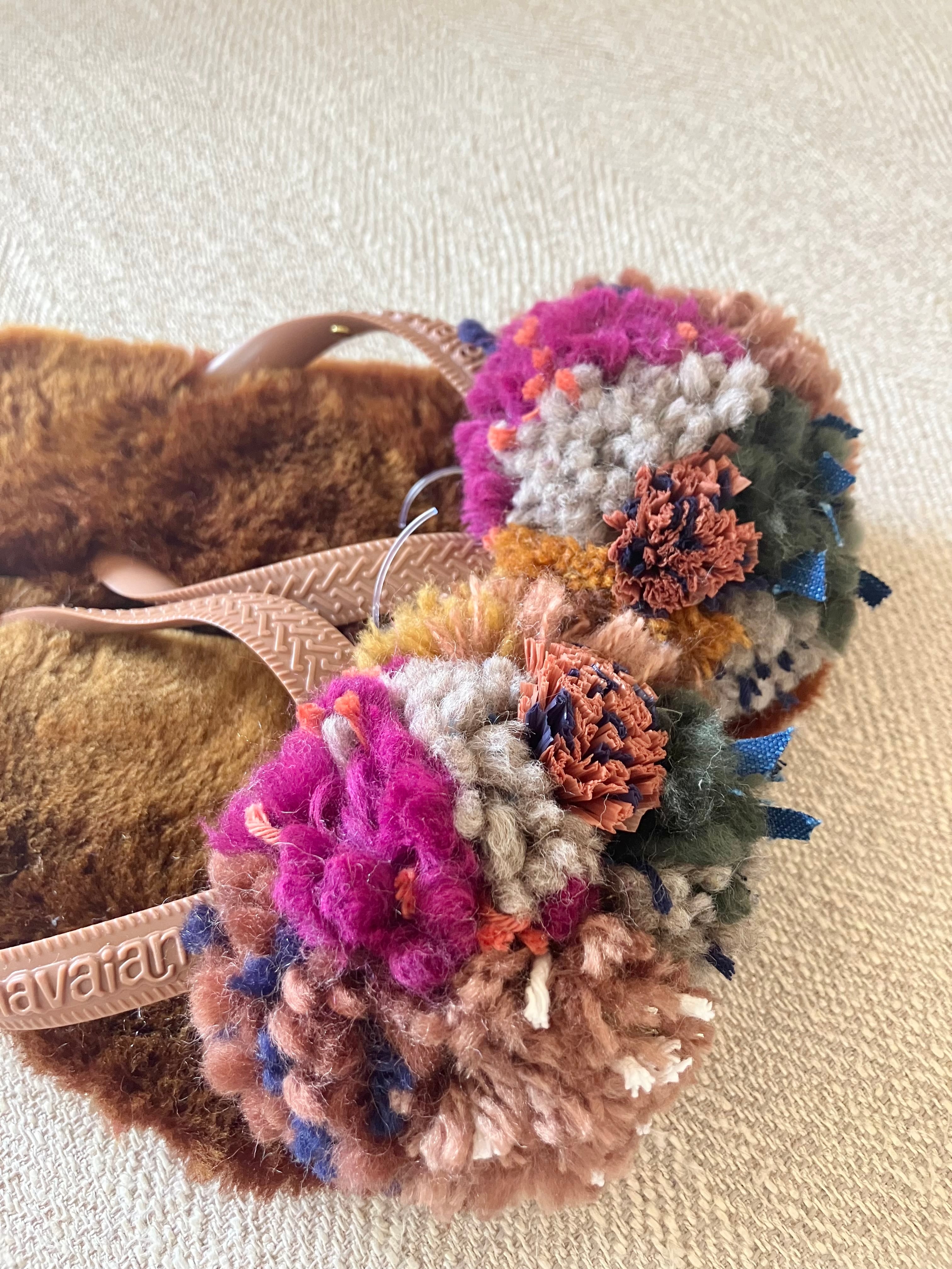 キャラメルみたいなこっくりしたブラウンベースにミックスカラーのボンボンを。