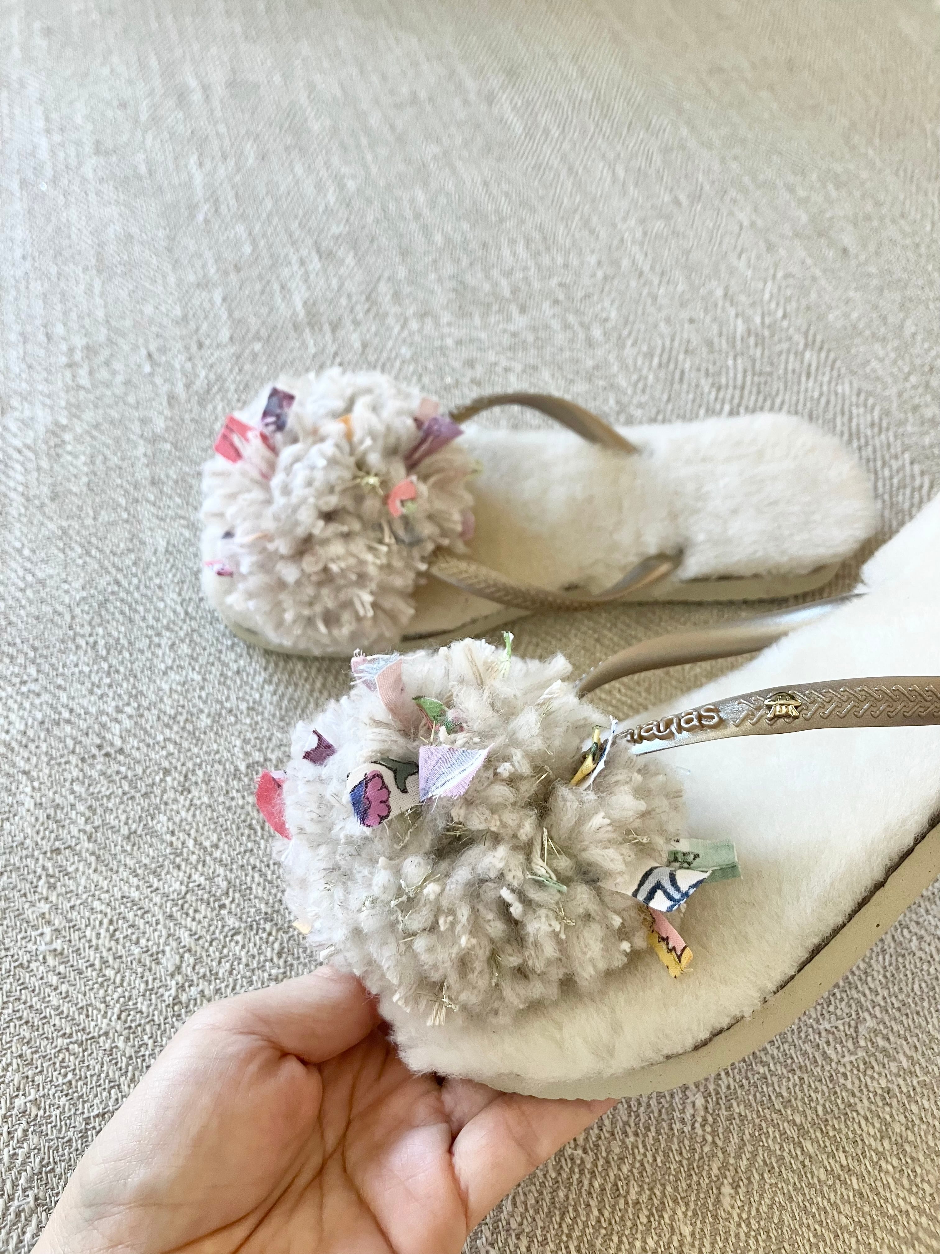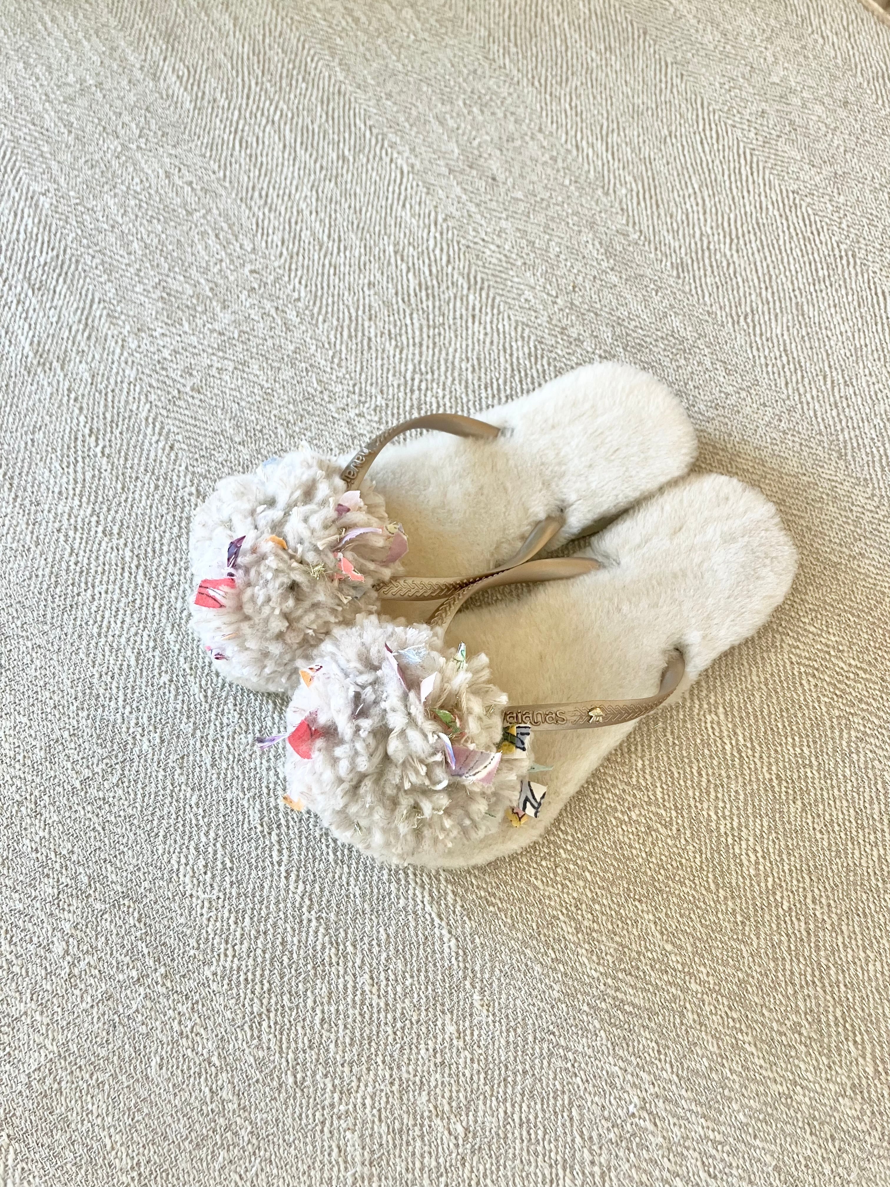 ボンボンは同色系の、エクリュベージュモヘアと、エクリュやホワイトのコットン、ゴールド糸をミックスしてシンプルに。