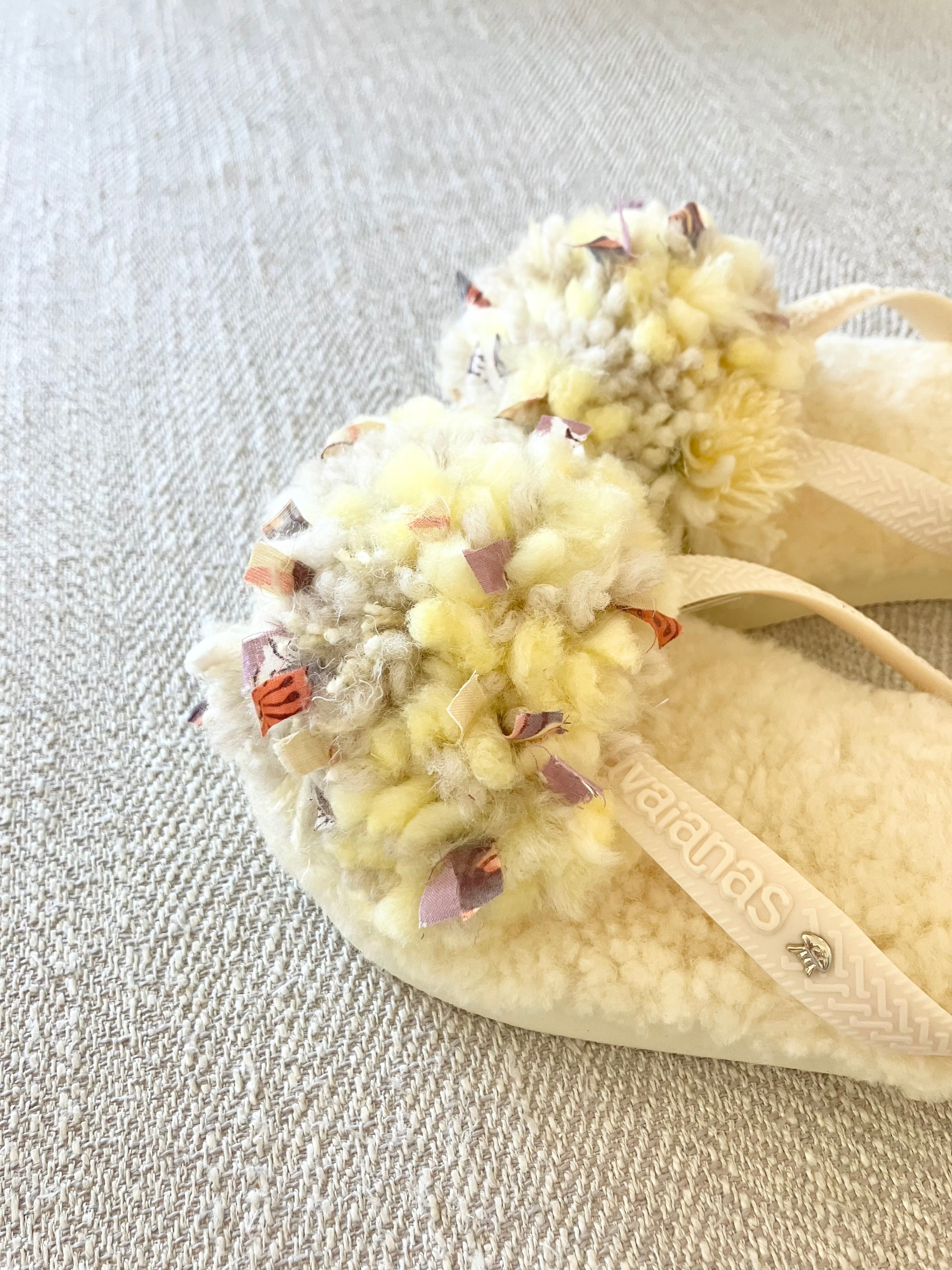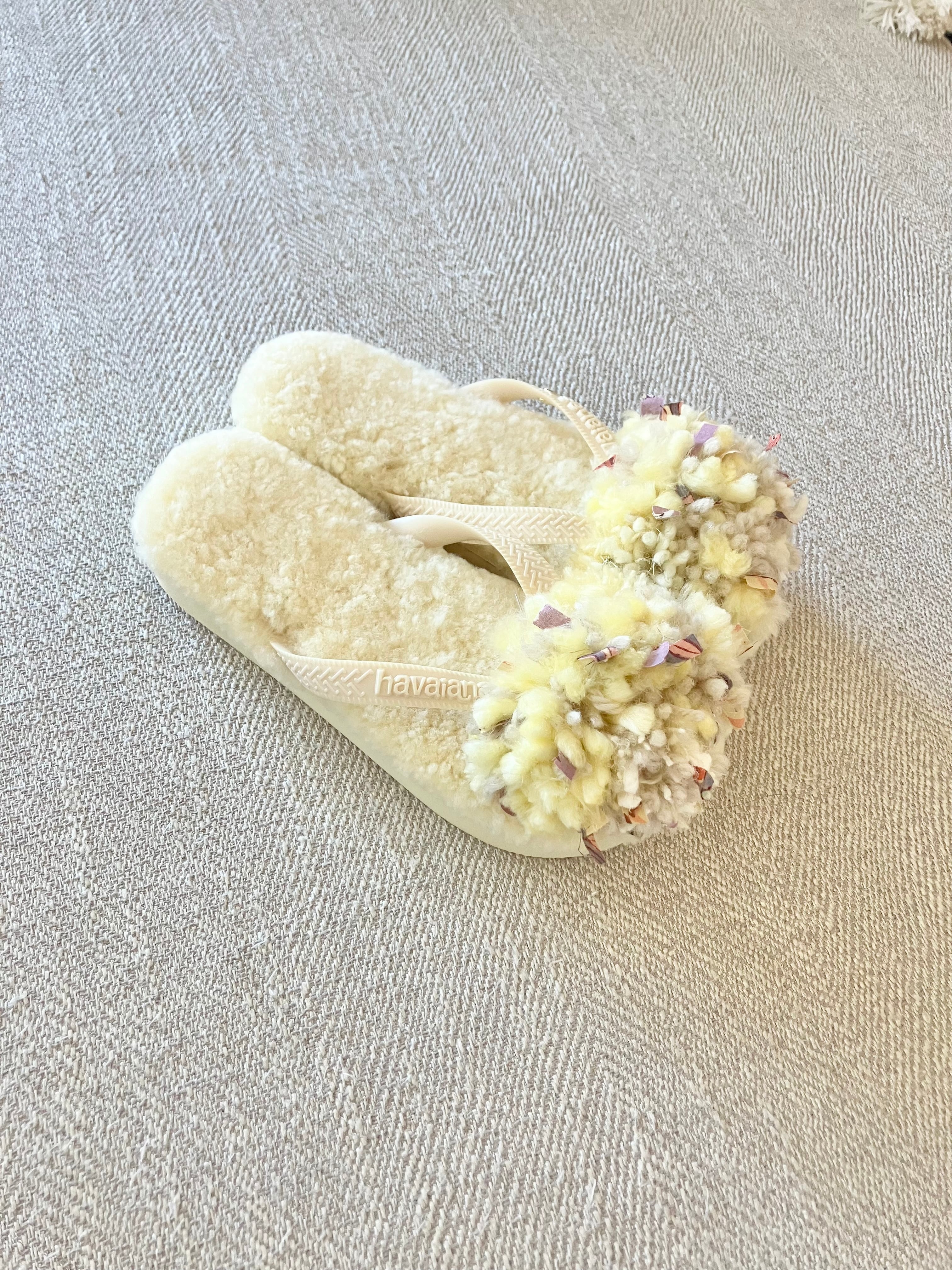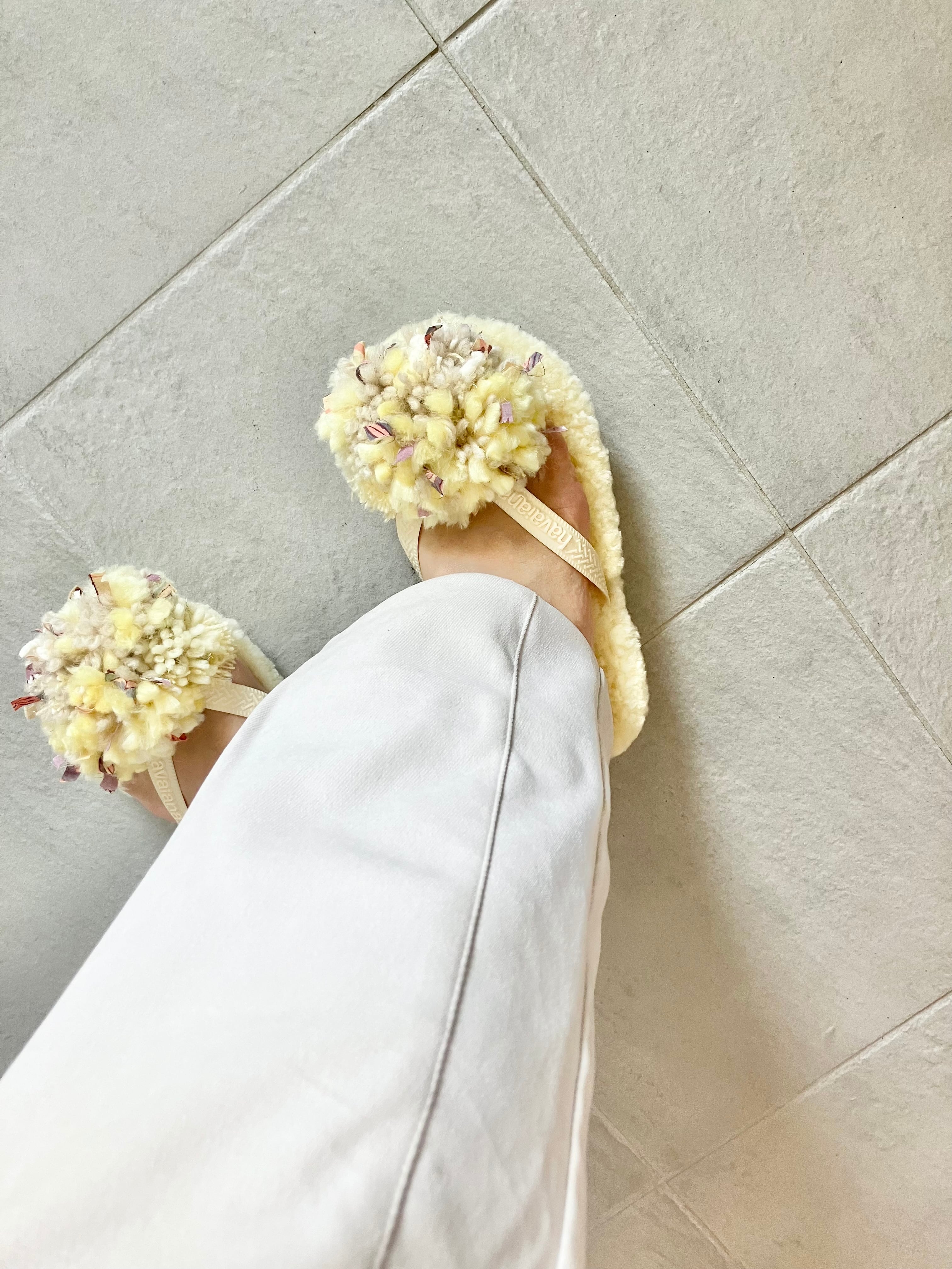 春の新色、注目のバターイエローのムートンにバタークリームカラーの鼻緒。