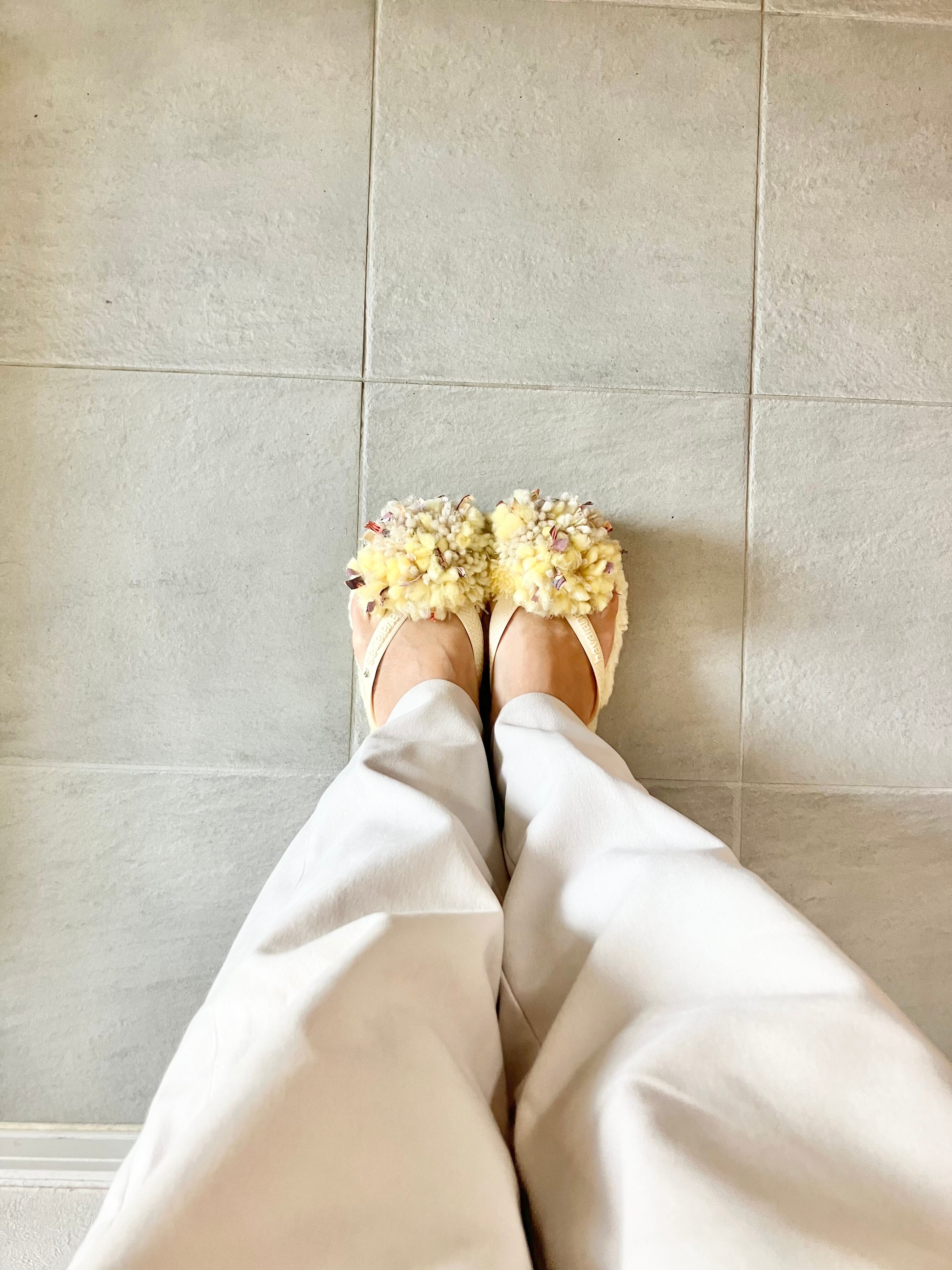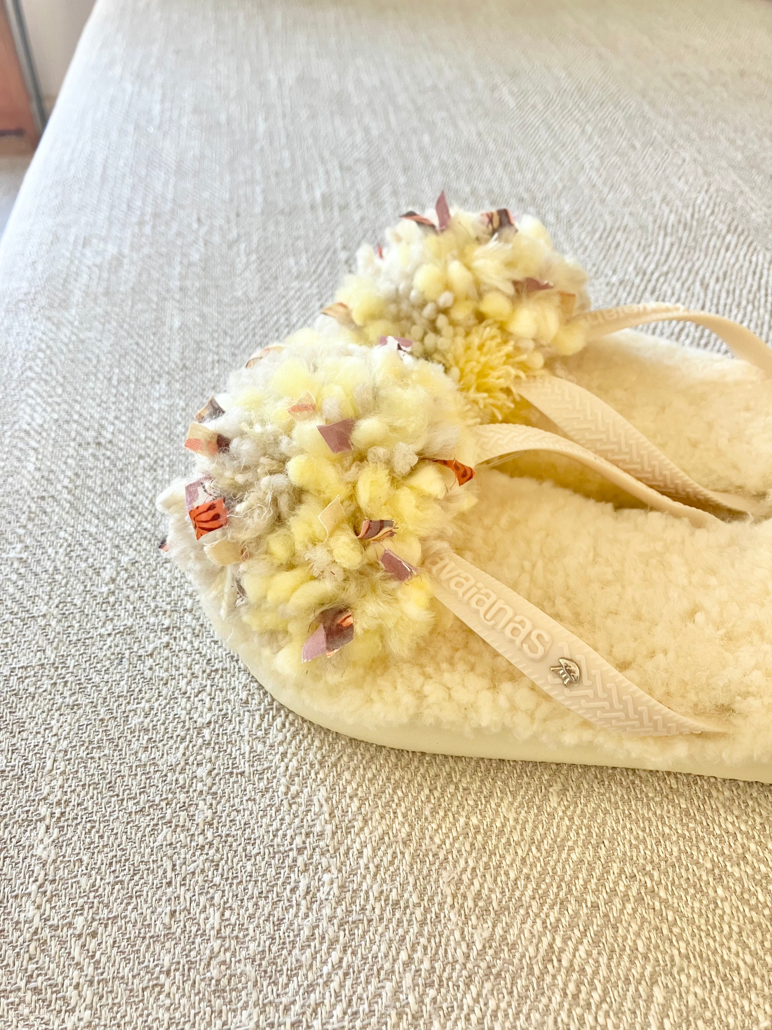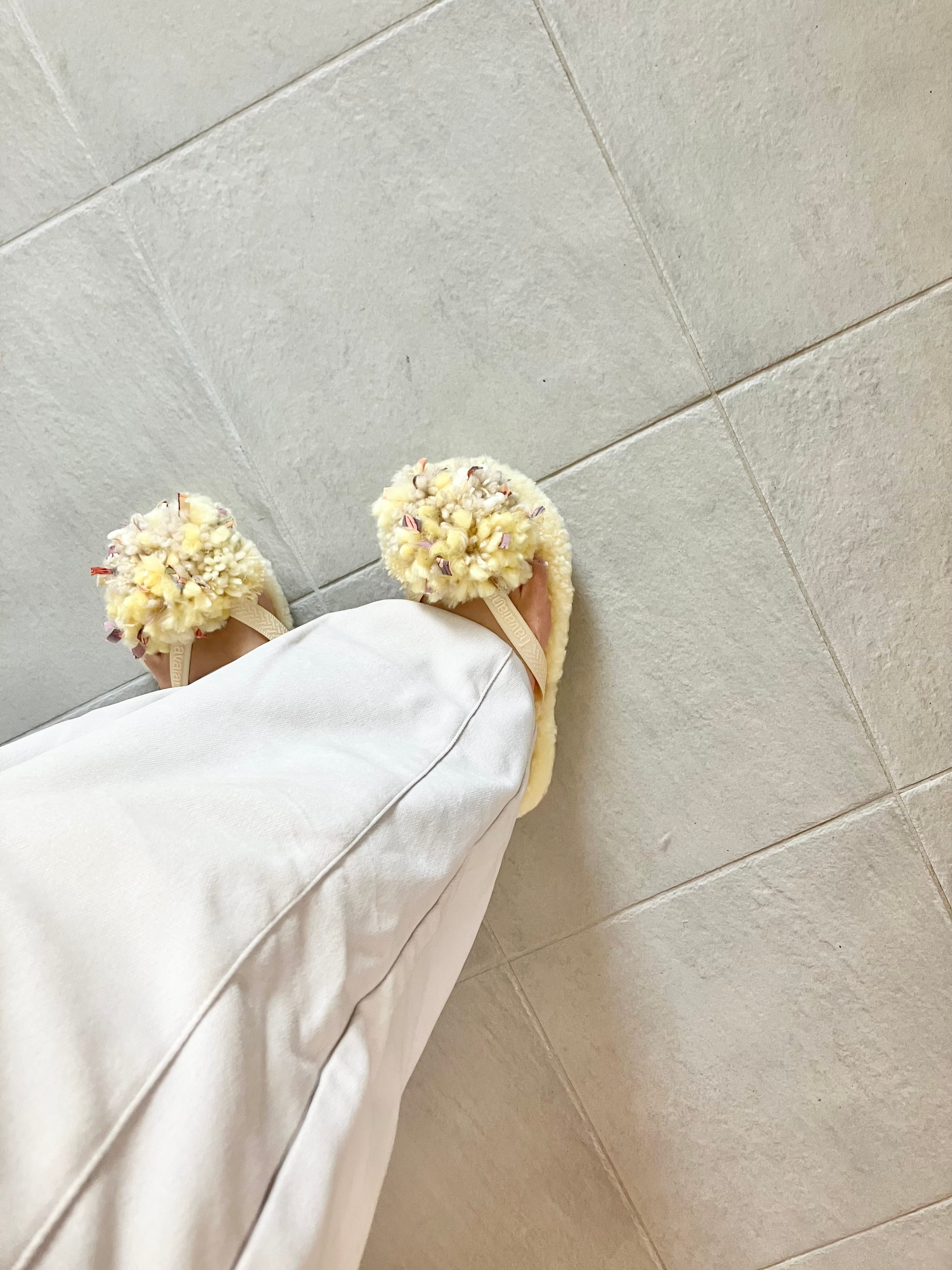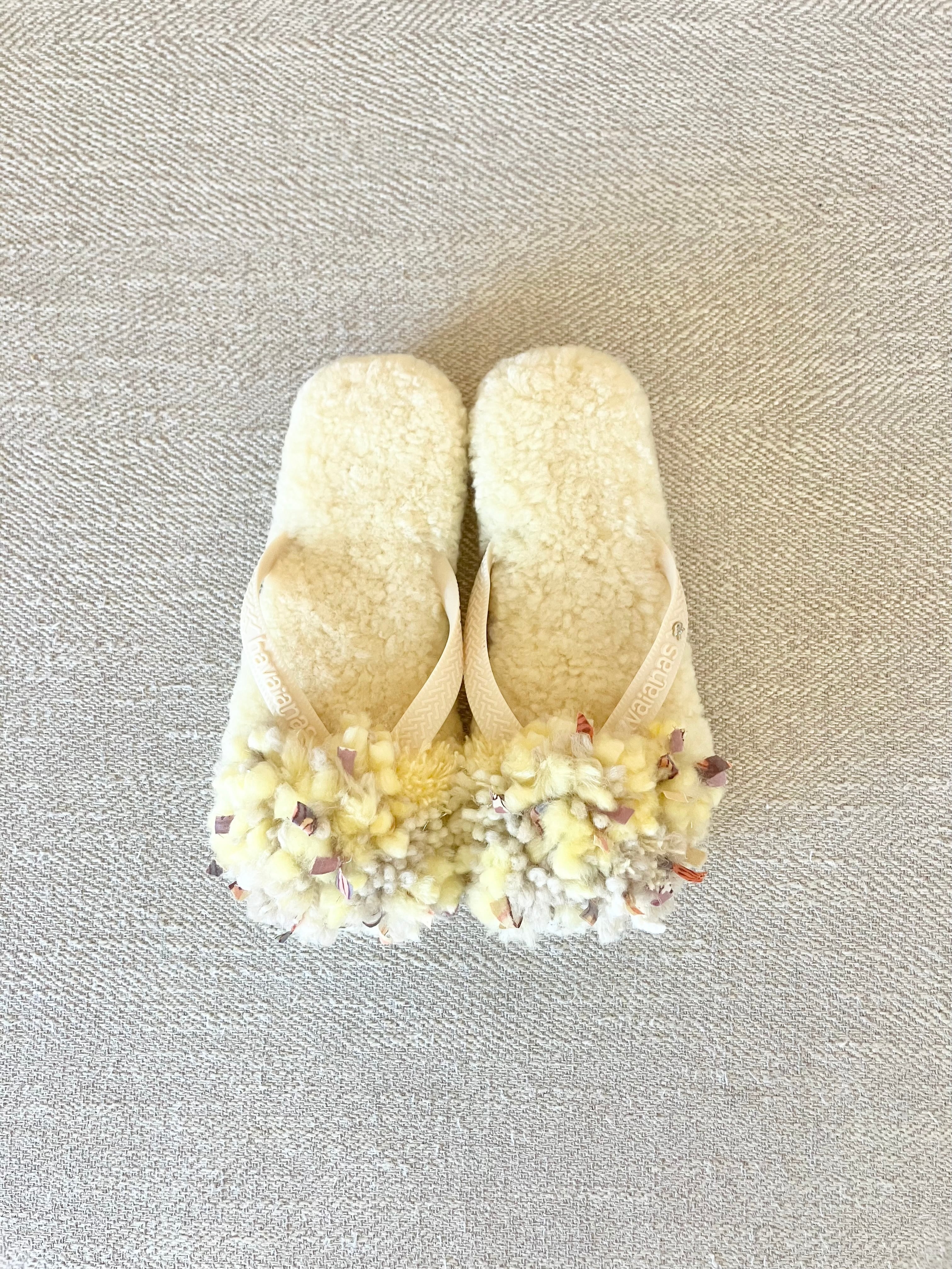 春の新色、注目のバターイエローのムートンにバタークリームカラーの鼻緒。