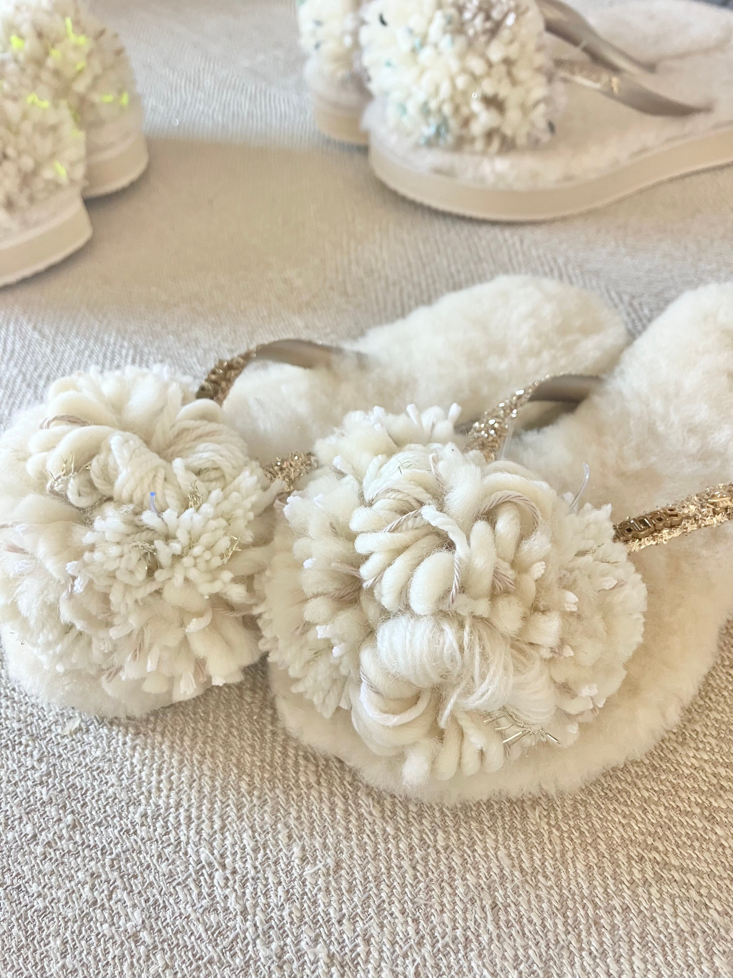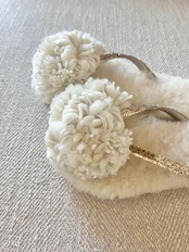 ホワイトグラデーションのミックスボンボンにはゴールド糸のアクセントをつけて。